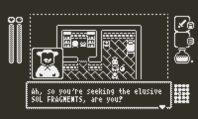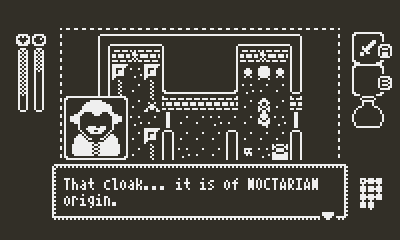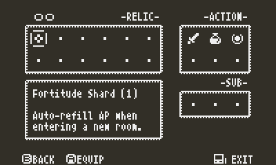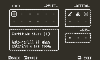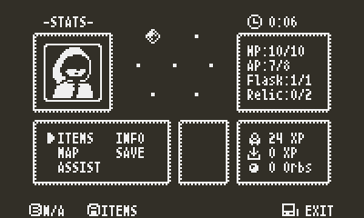 First comment on this site. Very good! Albeit a bit frustrating! I often find myself running out of AP, but I'm used to Zelda-likes rather than Souls-likes. HOWEVER, despite my, ahem, dislike of Souls-likes and general apprehension towards Souls-like mechanics, this feels like a mostly happy marriage of the two concepts so far. Given the lack of a start and/or a select button, I find that your use of docking the crank to open a menu is an absolutely genius move! I've seen some games on here make use of an option in the little circle button menu as a means of accessing in-game menus before, but this is much more clever and intuitive- great usage of the crank all around!